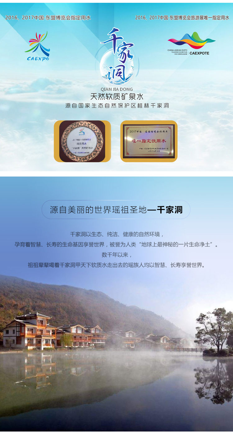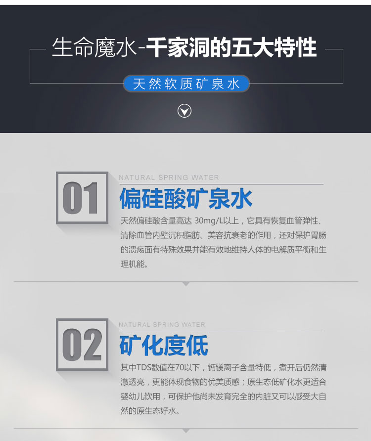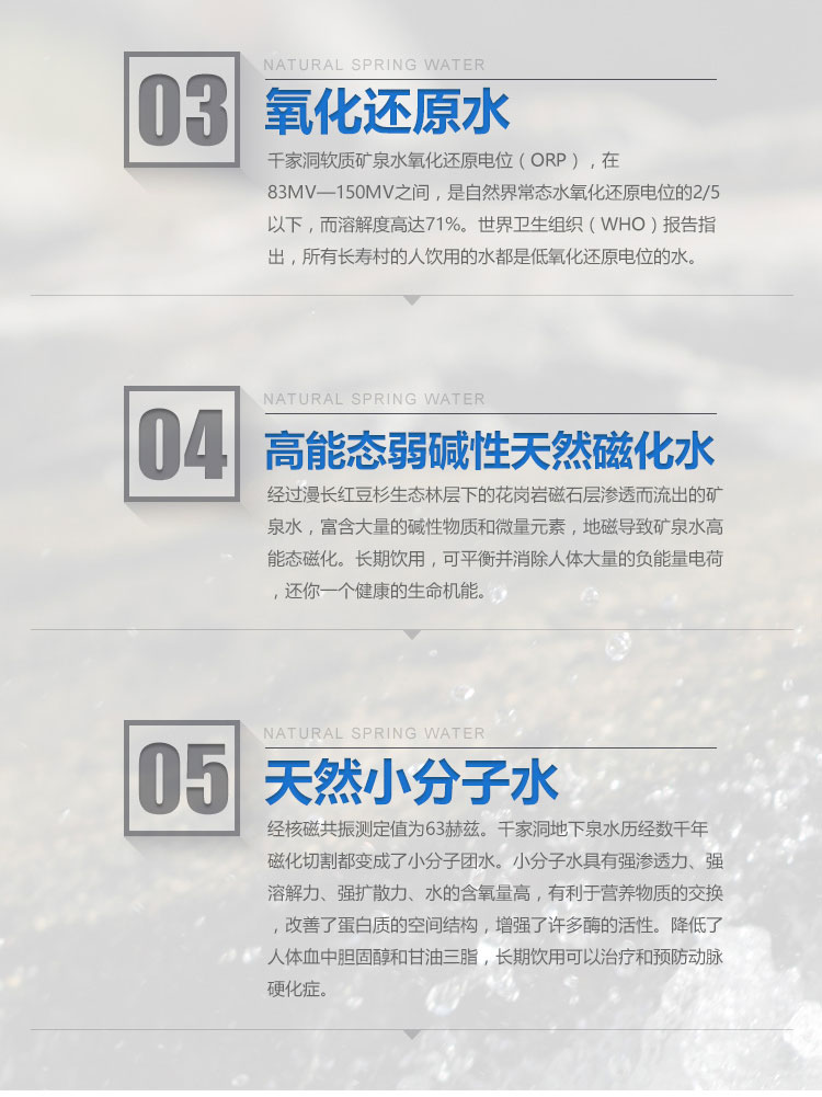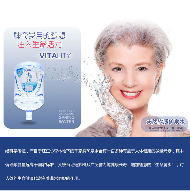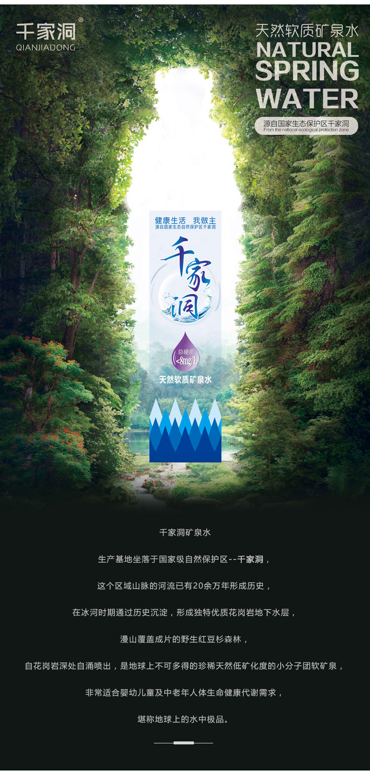 千家洞矿泉水生产基地坐落于自然保护区--千家洞,这个区域山脉的河流已有20余万年形成历史,在冰河时期通过历史沉淀,形成独特优质花岗岩地下水层,漫山覆盖成片的野生红豆杉森林,自花岗岩深处自涌喷出,是地球上的天然低矿化度的小分子团软矿泉,非常适合婴幼儿童及中老年人体生命健康代谢需求,堪称地球上的水中。